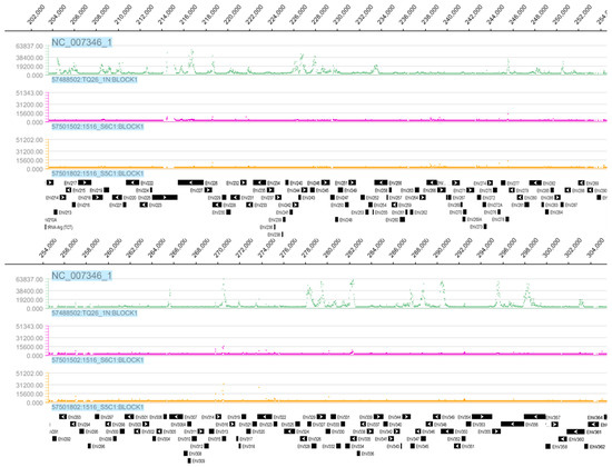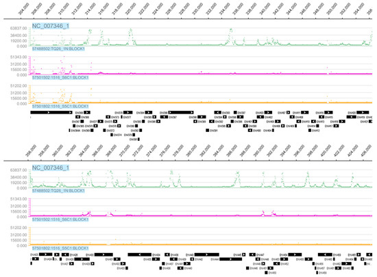 Nimblegen SignalMap displays of fluorescence values from TA for the whole EhV-86 genome (NC_007346_1) in base pairs with corresponding CDS map created by The National Center for Biotechnology Information (NCBI) [31] shown below each set of genome tracks. The first, second, and third tracks in green, purple, and orange display the expression profiles obtained from RCC1217 (1N) from chip 57288502, CCMP1516 infected with EhV-86 3.5 h p.i. from chip 57501502, and CCMP1516 infected with EhV-86 30 min p.i. from chip 57501802 (Table 3), respectively. Individual CDSs are illustrated as solid black rectangles with the internal white arrow head indicating the 5’ to 3’ coding direction.