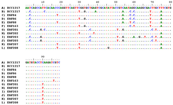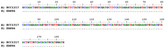 Multiple nucleotide sequence alignment of a 100 bp region of the viral MCP gene (ehv085). The MCP gene was amplified from RCC1217 using reverse transcription polymerase chain reaction (RT-PCR) on two separate occasions (A,B) and in both cases the sequence differed from all previously sequenced MCP genes fragments (C–L) obtained from GenBank [31]. Dots represent positions where the same nucleotides are present as in the top sequence, and letters represent nucleotide substitutions.