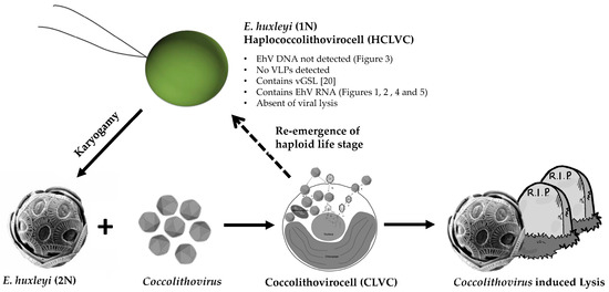 Flow cytometric analysis has shown the emergence of a sub-population of haploid cells after virus-mediated bloom demise [22]. Additionally, gene expression studies found that infection by EhV increased expression of pathways related to spermatogenesis [13], suggesting that the virus initiates gametogenesis and is an integral part of the E. huxleyi lifecycle (Figure 6). Previous work used PCR to show that EhV does not replicate in haploid E. huxleyi cells [11]. In HCLVCs we have detected the absence of EhV DNA, but the presence of RNA. The mechanisms behind this remain unexplored and there is no other example of a DNA virus with a separate RNA life stage where DNA is not detectable. The data presented here in combination with the viral GSLs detected in haploid cells by Hunter et al. [21] depict a different scenario to the Cheshire Cat dynamic. Future metabolomic and transcriptional studies will hopefully ascertain the breadth and mechanism of this infection.