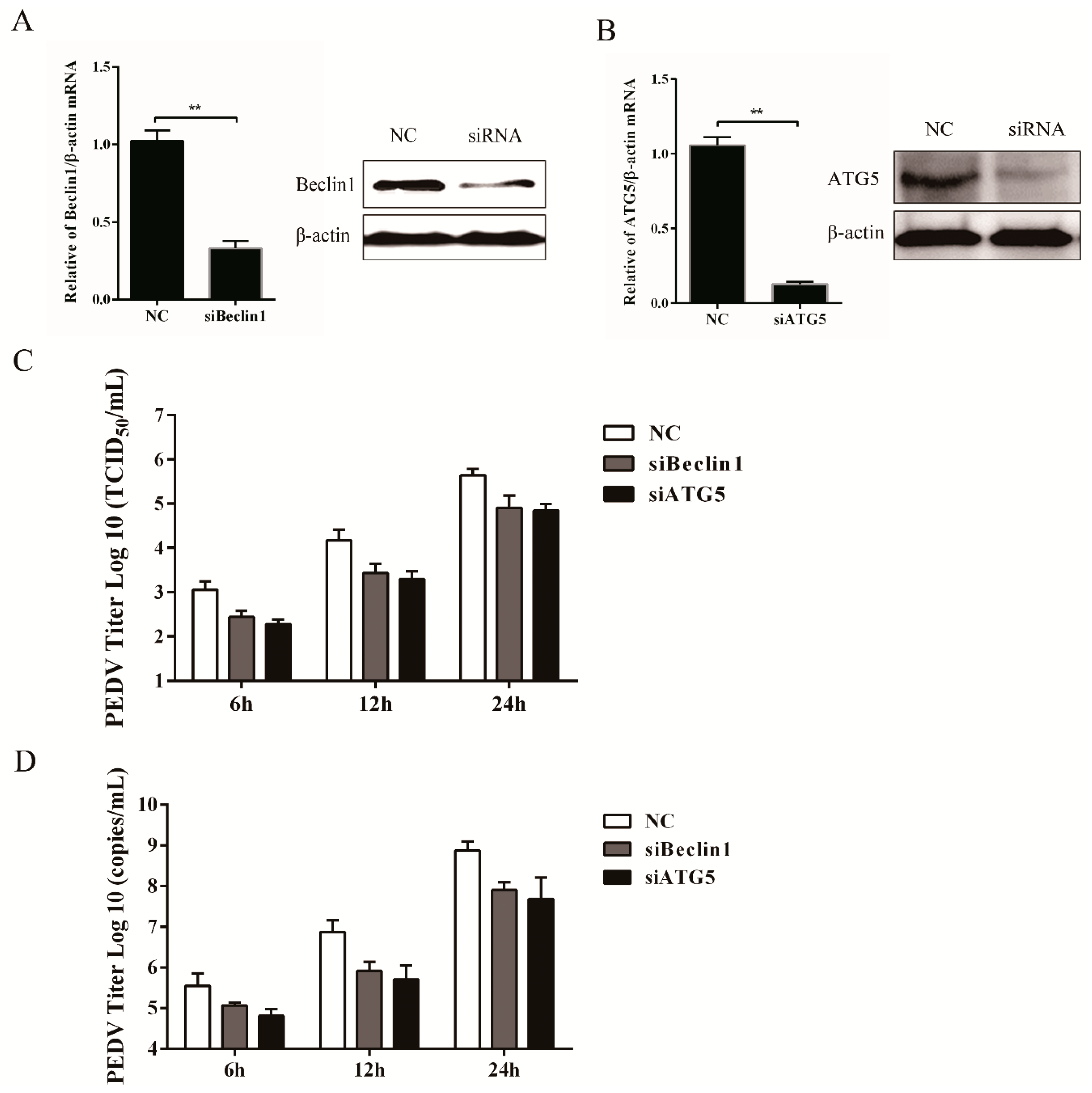 3.4. Silencing Endogenous Beclin1 or ATG5 Gene Reduces the PEDV Titer