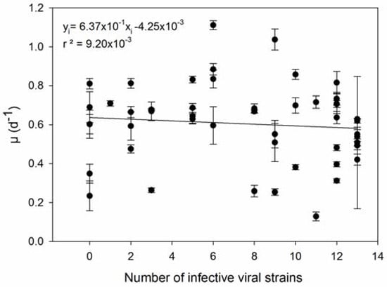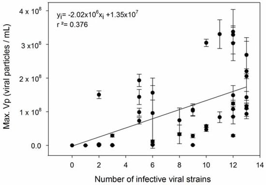 Number of viral strains infecting each algal strain and maximum viral production correlation. Error bars show standard deviation (n = 3).