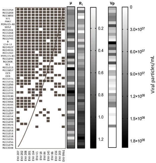 Viral-host infectivity network with a clear nested pattern (NODF value of 0.60) where specialist viruses tend to infect the most susceptible hosts, while viruses with broader host-range infect hosts with higher resistance. ■: infection; □: no infection. Sidebars represent μ, R1 and Vp parameters, respectively.