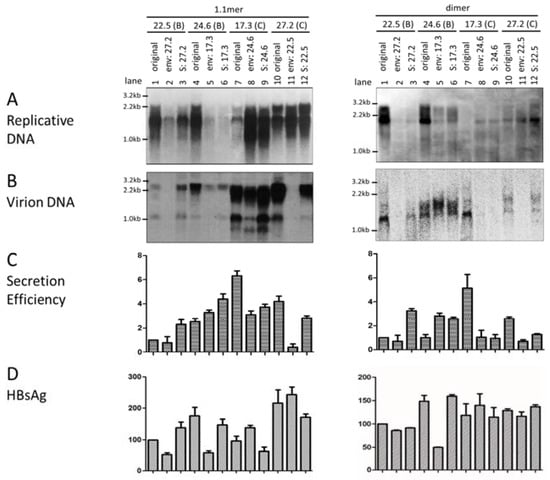 The objective of this study was to identify the structural basis for more efficient virion secretion by genotype C than genotype B. Based on our previous findings [], we chose two genotype B clones and two genotype C clones for further characterization. Full-length sequencing revealed that both clones 22.5 and 24.6 belong to the B2 subgenotype, while clones 17.3 and 27.2 belong to the C2 and C1 subgenotypes, respectively. Following transient transfection with the SphI dimer constructs into Huh7 cells, the level of intracellular replicative DNA was lower for the genotype C clones, especially 17.3 (Figure 1A, right panel). Virion secretion efficiency, as judged by the ratio of extracellular virion DNA/intracellular replicative DNA, was highest for clone 17.3, followed by 27.2 (Figure 1C, right panel). In the present study, we continued to employ the dimeric construct for making some chimeras and site-directed mutants. However, mutagenesis by restriction fragment exchange will revert a dimer into a monomer, necessitating the remaking of a dimer for each new construct. More importantly, the amount of virion DNA produced following transient transfection with SphI dimer constructs is rather low, as a consequence of the low replication capacity of genotype C clones. Towards this end, the 1.1mer construct was generated, with sequence 1818–3215/1–1932 inserted to the pcDNA3.1zeo (−) vector. This should lead to robust transcription of pgRNA driven by the CMV promoter [], thus greatly enhancing HBV DNA replication and, consequently, virion secretion. It was hoped that under the common CMV promoter, a similar level of pgRNA would be transcribed to achieve a comparable level of genome replication and thus simplify the comparison of viron secretion efficiency.
