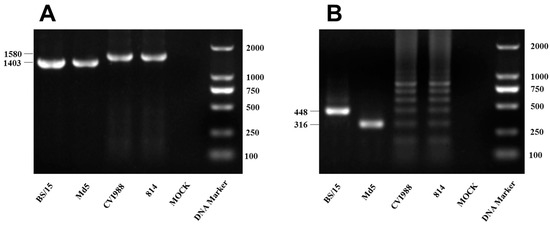 Detection of Marek’s disease virus (MDV) by polymerase chain reaction (PCR). DNA of MDV-infected chicken embryo fibroblasts (CEFs) was used as the template for PCR amplification. (A) PCR amplification of the meq gene of MDV. The PCR products of BS/15 and Md5 were 1403 base pair (bp) long, while those of CVI988 and 814 were 1580 bp, as they have a 177-bp insertion in the meq gene; (B) PCR amplification of the 132bpr of MDV. The PCR product of BS/15 132bpr was 448 bp long with a copy number of 3, while the PCR product length for Md5 was 316 bp with a copy number of 2, CVI988 and 814 showed PCR products 316–844 bp long and contained multiple copies of the 132bpr.
