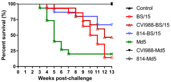 The earliest deaths appeared at 22 dpc in the BS/15-challenged unvaccinated group, while the first death in the Md5-challenged reference group occurred at 19 dpc. Furthermore, deaths in unvaccinated BS/15-challenged chickens peaked at 9–12 weeks post-challenge (wpc), which was much later than that in the unvaccinated Md5-challenged group at 4–7 wpc. These results suggested that BS/15 infection induced death slower than Md5 infection in SPF chickens. Survival analysis revealed that the death patterns of chickens challenged with BS/15 and Md5 were different (p < 0.05), as shown in Figure 3.
