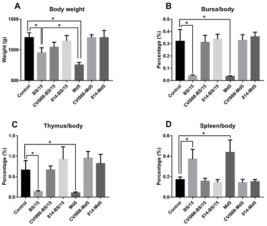 Body weights and ratios of immune organ weight/body weight in the surviving chickens of each group. The data are shown as mean with SD (n = 2 in the BS/15-challenged group, and n = 3 in the Md5-challenged control group, whereas n = 5 in the other groups), and differences were considered to be statistically significant at p < 0.05 (*). (A) Body weights of the surviving chickens in each group; (B) Ratios of bursa weight/body weight in the surviving chickens of each group; (C) Ratios of thymus weight/body weight in the surviving chickens of each group; (D) Ratios of spleen weight/body weight in the surviving chickens of each group.