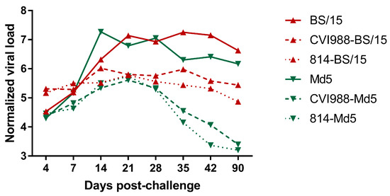 Although the number of surviving animals in the BS/15- and Md5-challenged groups were less, which is likely to introduce an analytical error, this defect had little effect on the overall analysis of these results, especially before 42 dpc.