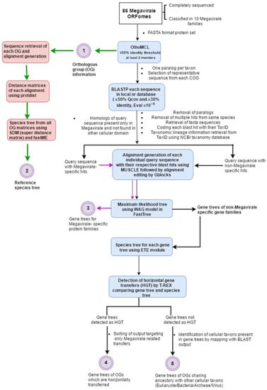Members of the proposed order Megavirales have been shown over the past decade to be very common in our environment [,] and giant viruses were also detected in humans and suspected to be potential human pathogens [,,]. Therefore, the need for understanding the major evolutionary forces guiding the evolution of Megavirale genomes and their gene history is growing, which makes it necessary to adopt some systematic searching for identifying the role of reticulate evolutionary events like HGT in evolution of distantly related Megavirale families. We herein describe an automated phylogenetic analysis workflow, MimiLook, that depends on the use of stringent filters to search systematically for probable instances of HGT in Megavirales. The workflow scripted in Perl connects existing programs to automate mining of conserved orthologous sequences among a designated number of Megavirale ORFomes, followed by a Basic Local Alignment Search Tool (BLAST) search to retrieve sequences of cellular domains of life that are homologous to these Megavirale clusters. The BLAST results are then subjected to alignment generation and phylogenetic tree (both gene tree and species tree) construction. Phylogenetic trees were then queried in T-REX [] algorithm for detection of HGT instances. A reference Megavirale family tree was constructed from the orthologous groups’ information and various evolutionary scenarios are then mapped to this reference tree. Along with detection of HGT, the output of the workflow reveals various information about orthologous groups (OGs), such as which are Megavirale-specific and OGs which form monophyletic clades with other cellular domains of life. Some of the identified transfers are in accordance with previous analyses []. The results are discussed in brief to give more emphasis on development of strategy and methodology which is our main aim to present here.