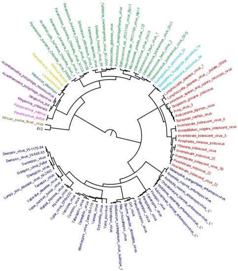 - Iyer, L.M.; Aravind, L.; Koonin, E.V. Common origin of four diverse families of large eukaryotic DNA viruses. J. Virol. 2001, 75, 11720–11734. [Google Scholar] [CrossRef] [PubMed]