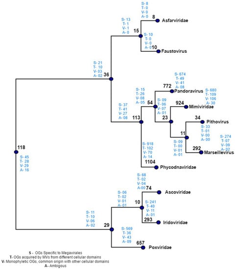 The following are available online at www.mdpi.com/1999-4915/9/4/72/s1, Figure S1: Mapping OGs and evolutionary scenarios on reference tree, Figure S2: An example output of statistically validated HGT as predicted by T-REX and then verified by human expertise, Table S1: 86 Megavirale ORFomes used in this study, Table S2: Grouped Megavirale genes in cluster of orthologus groups, Table S3: Presence/absence matrix of orthologus groups in respective Megavirale species, Table S4: Predicted evolutonary scenarios in OGs of Megavirales.