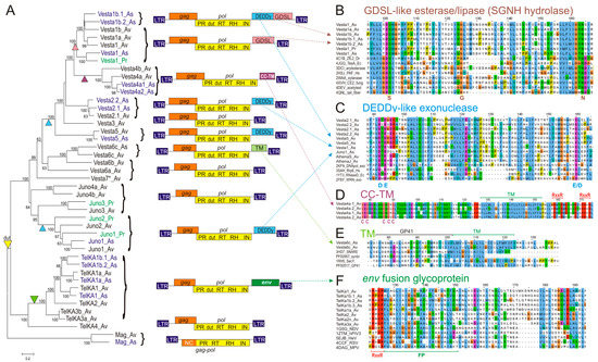 Structure, phylogeny and open reading frame 3 (ORF3) alignments of bdelloid long terminal repeat (LTR) retrotransposons. (A) Maximum likelihood phylogram of pol genes including protease (PR), dUTPase (dut), reverse transcriptase (RT), RNase H (RH), integrase (IN) domains and the associated ORF structure. Putative ORF3 acquisition/loss events are marked by triangles of matching color. Scale bar, amino acid substitutions per site; (B–F) Alignments of characteristic regions between retrotransposon ORF3s and selected GDSL esterases/lipases (B), DEDDy exonucleases (C), transmembrane (TM) proteins (D–E) and env fusion glycoproteins from paramyxoviruses (F). Also shown are catalytic S-G-N residues from SGNH block 3 (B), catalytic D/E residues from DEDDy block ExoI (C), Cys residues (D), TM domains (D–E), furin-like protease cleavage site (RXXR), and fusion peptide (FP) (F).