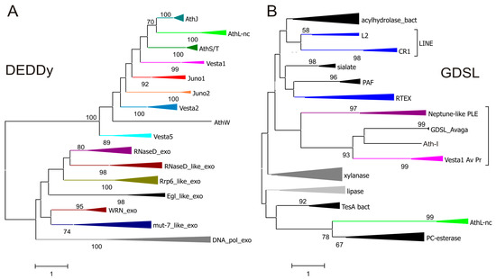 Diverse ORF3 functions in retrotransposons. (A) Amino acid sequence similarity between DEDDy-like ORFs from Juno and Vesta LTR retrotransposons, Athena retroelements, and different groups of cellular DEDDy exonucleases from cd09018 sequence cluster in the Conserved Domain Database (CDD); (B) GDSL-like ORFs in Vesta1 LTR-retrotransposons, PLEs, non-LTR (or LINE-like) retrotransposons from esterase-containing clades CR1, L2, and RTEX, and representative groups from the cellular SGNH hydrolase superfamily (cd00229 cluster in CDD). All ORF3 sequences shown in Figure 1 were included and collapsed for better visualization. Branch support values exceeding 50% are shown. Scale bars, amino acid substitutions per site.