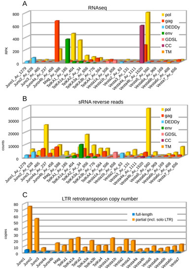 We also attempted to reveal correlations between the presence of ORF3, transcriptional activity, and copy number of LTR retrotransposons. Figure 3C visualizes the number of full-length and partial copies of LTR retrotransposons in each family, with a large proportion of partial copies represented by solo LTRs. While full-length copies are indeed scarce, a DEDDy-like ORF in Juno1 and Juno2 might be correlated with a higher overall copy number, however, Vesta2 and Vesta5 with the same ORF are low-copy. It is possible that the latter represent earlier arrivals, as evidenced by their more basal position on the phylogenetic tree, and that most of these copies have undergone removal by LTR-LTR recombination, as described in [15].