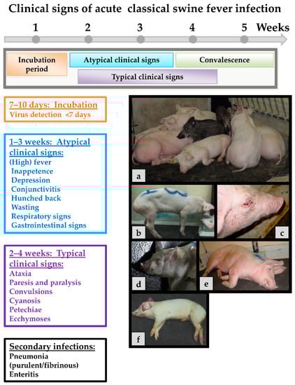 Classical swine fever can be divided into the following forms of the disease: an acute (transient or lethal), a chronic and a persistent course, which usually requires infection during pregnancy [65]. In general, the same clinical signs are seen in both domestic pigs and wild boar, and show up after an incubation period of four to seven (seldom 10) days after the infection. The progression is dependent on strain virulence, host responses, and secondary infections and may vary considerably. However, infection of young pigs (weaners) with a moderately virulent CSFV strain may serve as an example for the acute disease course: During the first two weeks upon infection, the acute phase is characterized by unspecific (often referred to as “atypical”) clinical signs like high fever, anorexia, gastrointestinal symptoms, general weakness, and conjunctivitis [108]. Around two to four weeks after infection neurological signs can occur including incoordination, paresis, paralysis and convulsions. At the same time, skin hemorrhages or cyanosis can appear in different locations of the body such as the ears, limbs, and ventral abdomen. These late signs are the textbook cases and are therefore referred to as “typical” CSF signs. Examples of clinical signs can be found in Figure 2.
