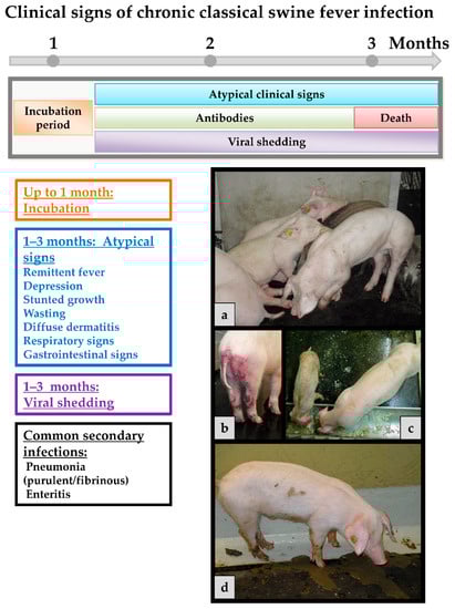 Chronic CSFV infection. The incubation period is the same as with the acute course. However, it may take up to a month until they are truly recognized. Atypical clinical signs can be present throughout and until death, occurring up to three months or even later after the infection. Antibodies can be detected at low levels after two weeks or later but do usually not persist. Viral shedding is observed from about four days post infection till the death of the animal. (a) Pigs are depressed, hunched over, and anorexic; (b) pig with petechial bleedings and ecchymosis in the anogenital region; (c) stunted and wasting pig beside a normally developed one of the same age; and (d) pig with diarrhea, shedding high viral loads until death.