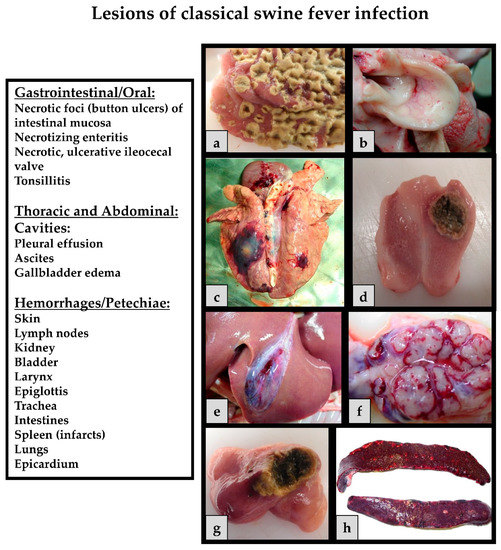 The pathological findings (Figure 4) depend on the course of the viral infection. In the acute course of CSF, pathology often reveals enlarged lymph nodes, hemorrhages and petechiae on serosal and mucosal surfaces of different organs such as the, lungs, kidneys, intestines and urinary bladder. Tonsillitis, necrotic ulcers in the intestines, lesions in the lymphoreticular system, and non-purulent encephalitis can be observed [126] Splenic infarctions can occur and are considered pathognomic for CSF [127]. Infected piglets develop leukopenia, thrombocytopenia and immunosuppression, which increases the risk for secondary infections and thus to diseases of the gastrointestinal and respiratory system [128]. In the chronic form, pathological lesions include atrophy of the thymus, depletion of the lymphoid organs, necrosis and ulceration of the small intestine, colon, and ileocecal valve. It is important to consider that these clinical signs and pathological lesions should be considered as differentials for a number of swine pathogens. These unspecific clinical signs and lesions can vary among animals depending on host factors and the virulence of the CSFV strain. Often, the age, breed and immune status play a role in the outcome of the disease [65,108,129].