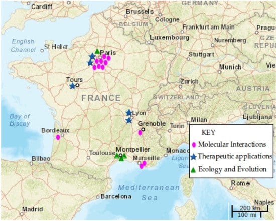 Geographic location of research groups presenting their work at the “Phages on MARSeille” meeting in 2016. Symbols and colours indicate the scientific or applied approach of each research. Map created with [].