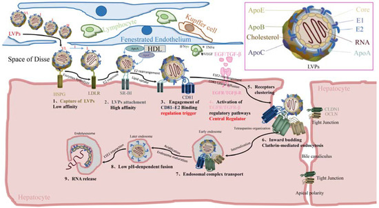 Proposed model of hepatitis C virus (HCV) entry into hepatocytes. The microstructure of the space of Disse of the liver is shown in the top-left corner. Foreign HCV particles are tightly associated with lipoproteins to form a complex termed lipoviroparticles (LVPs). Incorporated lipoproteins of varying densities from very low (VL), intermediate (I), and low (L) to high (H) are shown in the top right corner. LVPs are typically transported by sinusoidal blood flow into the space of Disse through fenestrated endothelium. The different HCV receptors, co-factors, and host cell components involved in HCV entry are shown. Major HCV entry steps are presented in bold text (from 1 to 9). Between the steps, relevant changes or interactions are indicated with arrows either above or below, indicating the direction of pathways involved in LVP entry. Upon their arrival in the space of Disse, infectious LVPs, which typically contain VLDL, are initially captured by HSPG and LDLR. This step involves sequential enzymatic hydrolyses by LPL and hepatic lipase to convert VLDL to LDL, via its intermediate form. Captured LVPs subsequently interact with SR-BI, owing to their high affinity to exposed E2 and CEs. Here, SR-BI mediates the transfer of ApoA and ApoC1 from HDL to the particles and causes E2 conformation change. This SR-BI-mediated change enables the particles to access and bind to CD81, inducing E1E2 conformational change. The engagement of CD81 triggers the sequential regulations that are centrally controlled by EGFR and TGFβ-R; most of these regulatory mechanisms are involved in subsequent processes leading to CD81 migration to tight junctions. Tight junction proteins CLDN1 and OCLN can then interact with the complex, likely via an OCLN–CLDN1 EL1–CD81 LEL molecular interface, leading to the clustering of tetraspanins. Thereafter, entry complexes clustered in tight junctions are internalized through inward budding and clathrin-dependent endocytosis; these processes are also controlled by multiple regulatory pathways. The primary endocytic vesicles are converted from early endosomes to late endosomes, and the maturation process is facilitated by RAB5A-mediated acidification. Following endosome acidification, virus particles are exposed to an acidified environment, which induces additional, irreversible conformational changes. Further, fusion is triggered by the insertion of fusion peptide into the late endosomal membrane. Late endosomes encounter and merge with lysosomes to form endolysosomes, which are then converted to the classical dense lysosomes, resulting in the ultimate release of viral genome into the cell cytosol. Abbreviations: VLDL, low-density lipoproteins; HSPG, heparan sulfate proteoglycan; LDLR, low-density lipoprotein receptor; LDL, low-density lipoprotein; CEs, cholesteryl esters; ApoA, apolipoprotein A; ApoC1, apolipoprotein C1; HDL, high-density lipoprotein; CD81, cluster of differentiation 81; EGFR, epidermal growth factor receptor; TGFβ-R, transforming growth factor β receptor; CLDN1, claudin-1; OCLN, occluding; LEL, large extracellular loop; RAB5A, Ras-related protein Rab-5A.