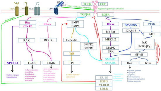 A proposed regulatory signaling network for HCV entry. Signaling activation and entry receptors are indicated in the figure. Only the factors that are related to HCV entry are shown. Relationships between upstream and downstream factors are not limited to regulation; certain downstream factors may serve as a receptor for upstream factors. Specific colors indicate different pathways, while arrows and red lines indicate the main process of a pathway and an inhibitory feedback regulation, respectively. The outcome is shown at the end of each pathway. This network highlights that HCV entry is centrally regulated by EGFR and TGFβ-R. Abbreviations: NPC1L1, Niemann-Pick C1-like 1; Cdc42, cell division control protein 42 homolog; RhoA, Ras homolog gene family, member A; ROCK, Rho-associated protein kinase; LIMK, LIM domain kinase ; BMP, bone morphogenetic protein; BMPR, bone morphogenetic protein receptor; TfR, transferrin receptor 1; MEK, mitogen-activated protein kinase kinase; MAPK, mitogen-activated protein kinase; ERK, extracellular signal-regulated kinase; SMAD6/7, mothers against decapentaplegic homolog 6 and 7; DC-SIGN, dendritic cell-specific intercellular adhesion molecule 3-grabbing nonintegrin; ICAM3, intercellular adhesion molecule 3; PI3K, phosphatidylinositide 3-kinases; AKT, protein kinase B (PKB); IκK, IκB kinase; NF-κB, nuclear factor κ-light-chain-enhancer of activated B cells; HuR, human antigen R; SR-BI, scavenger receptor class B type I.