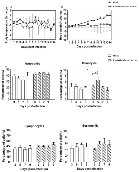 Generally, patients infected with this virus can appear to have various disease severities ranging from mild respiratory illnesses, such as cold-like clinical signs, to severe lower respiratory tract infections (LRTI), including pneumonia, wheezing, and bronchiolitis [26]. In our study, the clinical signs of respiratory illness, including cough, nasal discharge (Figure S1A) and dry nose (Figure S1B) were present in 4 of 15 infected animals. No significant increase in body temperature (Figure 1A) was observed in the ferrets with virus infection, while this phenomenon is in accordance with the clinical report that some patients with EV-D68 infection were characterized by low-grade or absent fever [27,28]. Although, there is an increase in all ferret body weight (Figure 1B) during the period of experimental observation, the uninfected ferrets gained more weight than the infected ferrets (a mean of 13.7% vs. 2.7%) at 14 days post-infection, indicating that the overall health of the mock ferrets was better. In addition, during early infection (5–7 days post-infection), some ferrets with EV-D68 infection had a slightly increase of neutrophils (from mean 42.3% to 44.6%) and monocytes (from mean 4.6% to 6.5%) when compared with the three days post-infection ferrets, but there is no change in the number of the lymphocytes and eosinophils (Figure 1C).