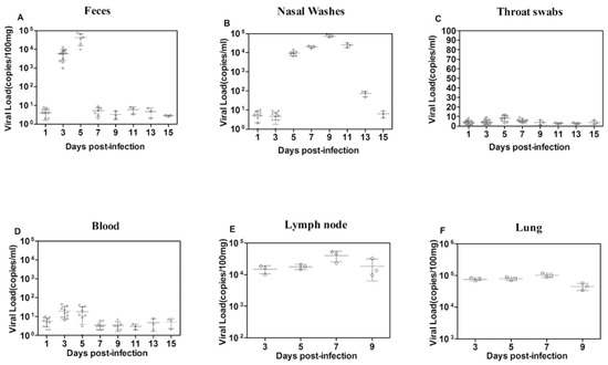 Total RNA was extracted from fresh tissue, feces, bronchoalveolar lavage fluid (BALF), and blood from the experimental animals using the TRNzol-A+ Reagent mini kit (TianGen Biotech, Co., Ltd., Beijing, China) according to the manufacturer’s instructions. The total RNA was eluted in a final volume of 20 µL. For quantification, a single-tube, real-time Taqman RT-PCR assay was performed using the Taqman one-step RT-PCR Master Mix in the CFX96 Touch™ Real-Time PCR Detection system (Bio-Rad, Laboratories, Hercules, CA, USA). The experiments were carried out by adding the primer (200 nm), FAM/TAMRA probe (100 nm) (TAKARA Biotechnology Co., Ltd., Dalian, China), and 2 μL of RNA into the Taqman PCR mater mix, of which total reaction volume is 20μL. The following sequences including EV-D68-specific primer and probe: forward primer, 5′-CACCATACTCACAACTGTGGCAG-3′; reverse primer 5′-CTAGCATTACTGCCTGATTGCCAATG-3′ and the probe 5′-TGACTTGACACTCCAAGCAATGTTTG-3′; The following reaction conditions were applied for all PCR experiments: 5 min at 42 °C and 10 s at 95 °C, followed by 40 cycles at 95 °C for 5 s, and 60 °C for 30 s. A standard reference curve was established by measuring the serially-diluted concentrations of the EV-D68 RNA standards generated from the in vitro transcription of a DNA gene fragment containing the EV-D68 p1 gene region.