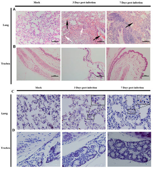 Pathological manifestations in respiratory apparatus of EV-D68-infected ferrets. (A) The clinical pathological features of EV-D68 infection in ferret lung tissues; (B) There is no pathological change in trachea. In these images, the white arrow represents the inflammatory cell infiltration, the black arrow points the diffuse alveolar hemorrhage. The microscope magnified the images 200 times, Bar, 100 µm; (C) The viral antigen expression in lung tissue from ferrets infected by 104.5CCID50 EV-D68. The black dashed boxes indicate the EV-D68 VP1 antigen expression and the insert picture enlarge the antigen (on the top right corner); (D) There is no VP1 antigen detectable in trachea. Images are magnified by 400 times; Bar, 50 μm.