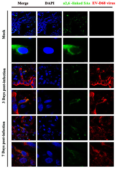 Confocal imaging of α2,6-linked SAs and viral antigen in the lung tissue of EV-D68-infected ferrets. The samples were obtained at three and seven days post-infection. EV-D68 VP1 antigen was labeled with Texas-Red-conjugated anti-IgG antibody (red), while α2,6-linked SAs were labeled with FITC (green). Images are shown at 630× magnification.