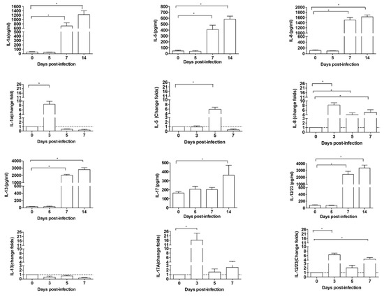 To determine the possibility of the pathological progress in the LRT of EV-D68-infected ferrets due to acute lung injury of inflammatory immune responses, we intended to evaluate the inflammatory cytokine levels in the lung during the early and late stages of infection. Despite the prominent use of ferrets in medical research, the immune system of ferrets remains poorly characterized. There are insufficient ELISA reagents for the detection of cytokines in ferrets, so we attempted to use the Bio-Plex Suspension Array System to evaluate serum cytokine levels. Numerous studies have reported that many animal species’ antibodies specific for cytokines can be used to detect ferret cytokines [35,36]. Therefore, in this study, the non-human primate cytokine Th1/Th2 assay was used to cross-test 23 cytokines and chemokines in ferrets following the protocol in the user manual (Figure S4). For verification of this test, the levels of gene expression were also measured by qRT-PCR. The results indicated differential expression of the inflammatory cytokines/chemokines in the LRT, showing high expression levels of interleukin-1α (IL-1α), IL-5, IL-8 (Figure 5A,B), IL-12, IL-13, and IL-17a in serum (Figure 5C,D), which correlated with the peak levels of viral shedding and pathological changes in the lungs. These data suggest that infection increased the release of inflammatory cytokines in the infected ferret lungs during early infection and lung pathology was continuously exacerbated during the progression of infection and caused lung edema as well as lung injury at the middle and late stages of infection.