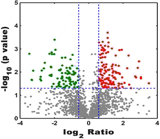Peptide results were searched using MaxQuant version 1.5.2.8 (Max Planck Institute, Munich, Germany), and the result showed that 2197 proteins were identified and quantified when the selected filter settings in the supporting information (Table S1) were used. A total of 1959 and 2060 proteins were found in the treatment groups and control groups, respectively. In the total proteins, 2197 proteins were identified in the two groups, and 137 and 238 proteins were specifically expressed in the treatment groups and the control groups, respectively (Figure 1). To understand the expression levels of these differential proteins, we plotted a volcanic map (Figure 2), called the volcano plot. The total numbers of the identified different proteins, which included 124 up-regulated proteins (red dots) and 96 down-regulated proteins (blue dots), (fold change > 1.5, p < 0.05) in the control and treatment groups was 220 (for more information see Supplementary Materials Table S2).