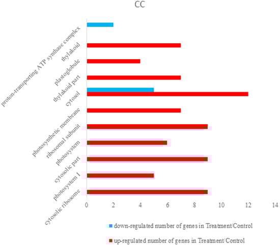 Some differently expressed proteins were grouped according to cellular components (CC), up-regulated proteins involved in cytosolic ribosome, photosystem I, cytosolic part, photosystem, ribosomal subunit, photosynthetic membrane, cytosol, thylakoid part, plastoglobule, and thylakoid. Down-regulated proteins only included cytosol and proton-transporting ATP synthase complex. Cytosol was mapped in the up-regulated and down-regulated proteins.
