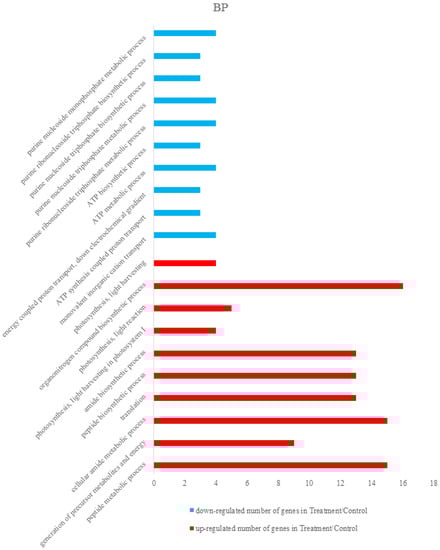 Some differently expressed proteins were grouped according to Biological process (BP). Some up-regulated proteins were involved in the peptide metabolic process, generation of precursor metabolites and energy, cellular amide metabolic process, translation, peptide biosynthetic process, amide biosynthetic process, photosynthesis, light harvesting in photosystem I, photosynthesis, light reaction, organonitrogen compound biosynthetic process, photosynthesis, light harvesting and partial down-regulated proteins mainly involved in monovalent inorganic cation transport, ATP synthesis coupled proton transport, energy coupled proton transport, down electrochemical gradient, ATP metabolic process, ATP biosynthetic process, purine ribonucleoside triphosphate metabolic process, purine nucleoside triphosphate metabolic process, purine nucleoside triphosphate biosynthetic process, purine ribonucleoside triphosphate biosynthetic process, and purine nucleoside monophosphate metabolic process.