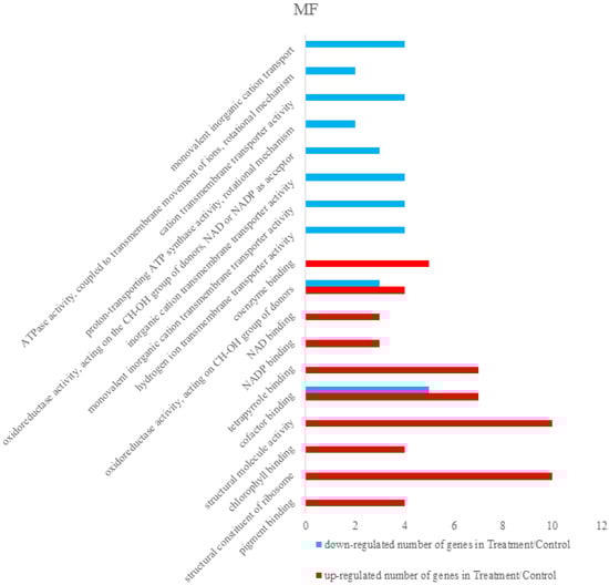 Proteins of molecular functions (MF) were mapped to pigment binding, structural constituent of ribosome, chlorophyll binding, structural molecule activity, cofactor binding, tetrapyrrole binding, nicotinamide adenine dinucleotide phosphate (NADP) binding, nicotinamide adenine dinucleotide (NAD) binding, oxidoreductase activity, acting on CH-OH group of donors, coenzyme binding, and down-regulate proteins were mapped to cofactor binding, tetrapyrrole binding, NADP binding, NAD binding, oxidoreductase activity, acting on CH-OH group of donors, coenzyme binding, hydrogen ion transmembrane transporter activity, monovalent inorganic cation transmembrane transporter activity, inorganic cation transmembrane transporter activity. Oxidoreductase activity, acting on the CH-OH group of donors, NAD or NADP as acceptor, proton-transporting ATP synthase activity, rotational mechanism and cation transmembrane transporter activity and ATPase activity, coupled to transmembrane movement of ions, rotational mechanism.
