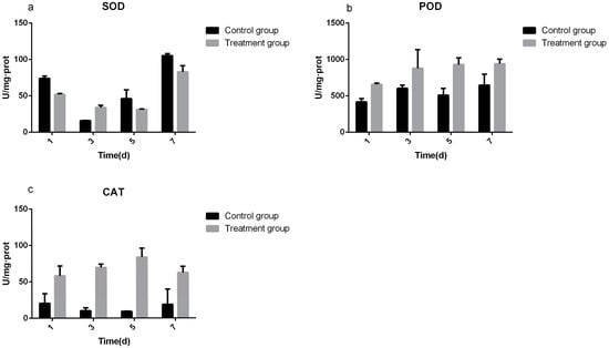 (a) Superoxide dismutase activities of COS treatment groups were 51.99, 33.93, 31.13, and 82.89 U/mg·protein (in 1, 3, 5, and 7 days, respectively). The control groups were 73.90, 15.90, 46.19, and 105.32 U/mg·protein (in 1, 3, 5, and 7 days, respectively). Only the third day is higher than the control groups. (b) The activities of Peroxidase in the treatment groups and control groups. The treatment groups were 658.37, 878.81, 929.02, and 940.74 U/mg·protein (in 1, 3, 5, and 7 days, respectively). The activities of control groups were 416.44, 604.58, 509.69, and 646.51 U/mg·protein (in 1, 3, 5 and 7 days, respectively). The treatment groups were 1.58, 1.45, 1.82, and 1.46 times higher than that of the control group. The activities of Catalaseare shown in (c), the treatment groups activities were 58.24, 69.61, 83.84, and 62.55 U/mg·protein, (in 1, 3, 5, and 7 days, respectively). They are higher than the control groups activities that were 20.50, 10.36, 9.19, and 18.71 U/mg·protein respectively. The fifth day activity had the biggest difference; the treatment group is 9.12 times of the control.
