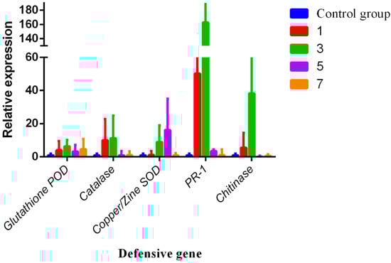 Gene expression of the defense genes were performed by RT-qPCR. The relative expression of defense genes, including Chitinase, Catalase, Glutathione POD, SOD, and PR-1, in different stages (1, 3, 5, and 7 days), were highly up-regulated by COS treatment.