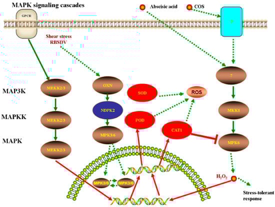 In addition, KEGG Automatic Annotation Server 2.1 (KAAS) (http://www.genome.jp/tools/kaas/) was used to conduct pathway enrichment []. Two specific proteins, nucleoside diphosphate kinase (NDPK2) (Q5TKF4_ORYSJ) and catalase (Q9ZRI9_ORYSJ) were found to play important roles in the MAPK signaling cascade pathway. A previous study showed that NDPK2 is a key metabolic enzyme that can maintain the balance of ATP in cells. It was accumulated strongly after infection with Xanthomonas oryzae pv. oryzae []. The results of the present study showed that NDPK2 was only expressed in the control groups, in which rice was infected with SRBSDV. This result also indicated that NDPK2 is a specifically expressed substance after the rice was infected by the pathogen. NDPK2 indirectly down-regulated mitogen-activated protein kinase (MPK3/6) expression, which can enhance the activities of peroxidase family []. Transcription factors of WRKY22 and WRKY25, which are a class of DNA-binding proteins, were indirectly affected by MPK3/6. WRKY transcription factors alleviated oxidative stress tolerance [,]. Ultimately, the expression of related defense enzymes (CAT, POD, and SOD) were inhibited, thus NDPK2 can be a marker in SRBSDV-infected rice. However, after COS treatment, the cells produced H2O2, which induced the specific up-regulated expression of catalase through a kind of phosphate cascade reaction. The catalase then inhibited H2O2 production and enabled the cells to remove the harmful effects of reactive oxygen species and elicit a stress-tolerant response. This process is shown in Figure 8.