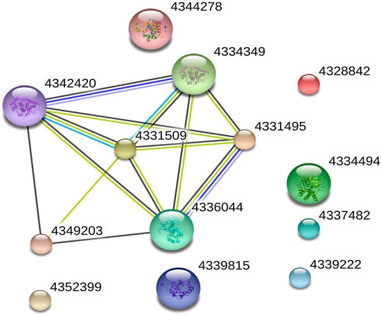 An essential catalase (4331509) was detected through the protein-protein interaction (PPI) networkin Figure 9. This catalase interacted with five proteins, including glyceraldehyde-3-phosphate dehydrogenase (4336044), glyceraldehyde-3-phosphate dehydrogenase (4331495), hydroxy acid oxidase 1 (4342420), hydroxy acid oxidase 1 (4334349) and glutathione S-transferase (4349203). Previous studies indicated that glyceraldehyde-3-phosphate dehydrogenase enhances tolerance to abiotic stresses through the regulation of H2O2 levels in rice []. The glutathione S-transferase and CAT can increase oxidative stress protection in glutathione S-transferase and CAT transgenic rice plants []. These results indicated that catalase mainly played essential roles in the regulated resistance of COS. Our enzyme activity tests and gene quantification results indicated that COS promoted defense-related antioxidant enzymes and gene expression both increases. Interestingly, the PR-1 transcription level increased dramatically. This suggested that COS might also activate rice-associated immune responses through other pathways or ways to resist further replication of the SRBSDV. In Arabidopsis plants, recent studies have shown that COS can induce plants to produce PR-1 protein through the salicylic acid pathway []. Our resultsprovide some basis for further study of the COS mechanism.