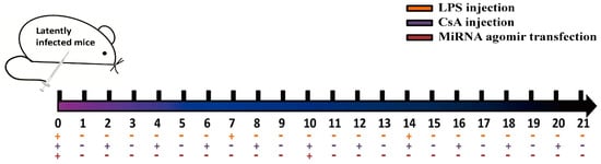 The induction of MCMV reactivation using lipopolysaccharide (LPS) and cyclosporin A (CsA) (both from Sigma-Aldrich, St. Louis, MO, USA) was adapted from previous reports [35,36]. Briefly, BALB/c mice with latent MCMV infection were divided equally into three groups. All mice were injected intraperitoneally with LPS (15 μg/kg, weekly) and CsA (20 mg/kg/d, every other day) for three weeks. To overexpress viral miRNAs, the mice received hydrodynamic injections of 2 mL phosphate buffered saline (PBS) containing 300 μg miR-m01-3-5p, miR-M23-1-5p, or negative control agomir (NC-agomir) on day 0 and day 10 (see Figure 1 for details). On day 21, all animals were euthanized using CO2, and the livers were collected to determine viral loads as described above. Livers from latently infected mice without drug administration were also measured as a negative control.