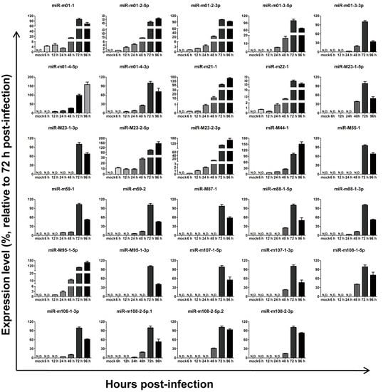 To investigate the expression kinetics of miRNAs encoded by MCMV in vitro, MEF cells were infected with MCMV (Smith strain), and total RNA was extracted at different time points following infection. Based on melt curve analyses, the levels of all29 MCMV miRNAs recorded in miRBase (Version 21) were examined using real-time quantitative polymerase chain reaction (RT-qPCR), as previously described [31,32]. After aggregating the data, the relative expression levels were calculated as fold changes relative to level at 72 hpi (Figure 2). The results showed that all 29 miRNAs were detectable at 72 and 96 hpi, although with different kinetics and expression onsets.