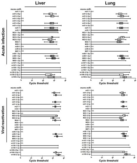 We next tested the expression of MCMV miRNAs in vivo. Multiple organs or cell types are invaded during primary infection. However, only a few of these (e.g., liver, lung, and peripheral blood leukocytes) have been reported as sources of latent infection at high risk for viral recurrence [37,38,39]. Additionally, studies investigating rats infected with rat cytomegalovirus revealed viral miRNA expression profiles that were tissue-specific and associated with different states of viral infection [40]. Therefore, miRNA profiles were measured in the livers, lungs, and blood at both primary and recurrent infection.