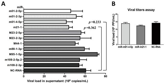 To further investigate the effects of viral miRNAs on MCMV replication, TCID50 assays were also performed on MCMV-infected cells transfected with the mimics, inhibitors of two representative miRNAs (miR-m01-3-5p and miR-M23-1-5p), or NC-RNA at two concentrations (30 and 100 nM) (Figure 5B,C). The results showed that overexpression of miR-m01-3-5p or miR-M23-1-5p inhibited viral replication in a dose-dependent manner.