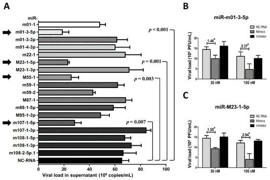 The overexpression of several Group 2 viral miRNAs inhibits MCMV replication. MEF cells were transfected with specific mimics of viral miRNAs or NC-RNA, followed by MCMV infection. Viral copies were quantified at 72 hpi using qPCR (A). To further investigate the effects of viral miRNAs on MCMV replication, the mimics, inhibitors of two representative miRNAs (miR-m01-3-5p and miR-M23-1-5p), or NC-RNA were transfected into MEFs at two concentrations (30 and 100 nM), followed by MCMV infection. Viral titers were examined using TCID50 assays, as described above (B,C). The results are shown as the mean ± SD. The assays were performed in triplicate wells, and all data were confirmed with three independent experiments. The different fold changes are shown above the horizontal bar. * p < 0.05 for viral miRNA-transfected versus NC-RNA-treated MEFs.