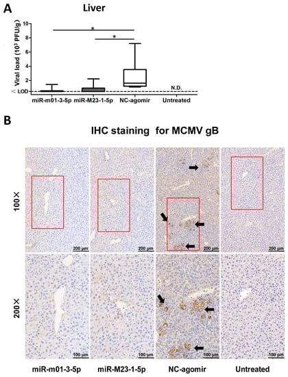 MCMV miRNA agomirs reduce MCMV recurrence in vivo. (A) After viral reactivation and transfection, livers were collected and analyzed to assess viral load; livers from latently-infected mice without drug administration were also measured as negative control. (B) To visualize viral reactivation in animal livers, immunohistochemical (IHC) staining targeting MCMV-gB antigen was performed (black arrow: recurrent virus; red box: the selected magnified area; magnification: 100×/200×). Data are based on two identical experiments. Dashed lines indicate the limit of detection (LOD) for the titer assay. * p < 0.05 for miRNA agomir-transfected group versus NC-agomir-transfected group.