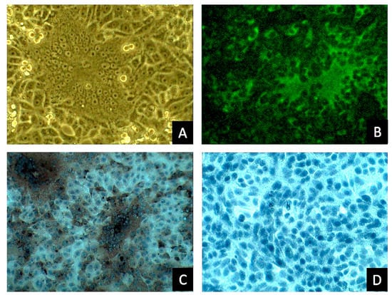 Supernatants of the virus-inoculated Vero cells showing typical CPE were eluted, 200 µL of 80% ice-cold acetone (Sigma-Aldrich, St. Louis, MO, USA) was added to each well, and the cells were fixed at −20 °C for 10 min. After fixation, acetone was removed, and the plate was air dried at room temperature for 30 min. The air-dried cells were then incubated with an in-house anti-PEDV N protein monoclonal antibody diluted 1000-fold (for ICC stain) or with PEDV hyperimmune pig serum diluted 200-fold (for IFA) and incubated at room temperature for 1 h. After incubation, the wells were washed three times with phosphate-buffered saline (PBS). For IFA, 100 μL of fluorescein isothiocyanate (FITC)-labeled goat anti-mouse immunoglobulin G (IgG) (Bethyl Laboratories, Montgomery, TX, USA) diluted to 200-fold in PBS was added to each well and incubated in dark at room temperature for 1 h. For ICC, a polyclonal anti-rabbit/mouse immunoglobulin EnVision-DAB+ system (Dako, Carpinteria, CA, USA) was used according to the manufacturer’s protocol. After incubation with the secondary antibody, each well was washed three times with PBS. For ICC staining, the labeled cells were exposed to 3,3′-diaminobenzidine (DAB) chromogen using a peroxidase DAB substrate kit (Dako, Carpinteria, CA, USA), according to the manufacturer’s instructions. For IFA, the labeled cells in the 96-well plate were mounted with 1% glycerol (Sigma-Aldrich) in PBS. The stained cells were detected using an inverted light/fluorescence microscope.