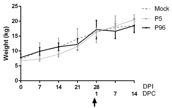 Figure 2. Weekly change in the body weight of 5-week-old pigs after porcine epidemic diarrhea virus strain Pintung 52 (PEDVPT)-P5 or PT-P96 inoculation. The weekly differences in mean body weight for each group are shown as mean ± standard error of the mean (SEM). The black, gray, and dashed lines illustrate the values obtained for the PEDVPT-P96-inoculated group, PEDVPT-P5-inoculated group, and mock-infected group, respectively. The arrow indicates the time point when the pigs were challenged with the low passage PEDVPT-P5 (27 DPI or 0 DPC) strain. P5: low passage virus, PEDVPT-P5; P96: high passage virus, PEDVPT-P96; mock: PI medium control; DPC: days post-challenge.