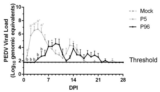 Figure 3. Fecal shedding of PEDV in 5-week-old pigs after porcine epidemic diarrhea virus strain Pintung 52 (PEDVPT)-P5 or PEDVPT-P96 inoculation. Changes in the mean values of genomic equivalents (GE)/mL are shown as log10 values ± SEM. The threshold indicates the limitation of detection for the SYBR Green-based real-time PCR (RT-PCR). The black, gray, and dashed lines illustrate the results obtained for the PEDVPT-P96-inoculated group, PEDVPT-P5-inoculated group, and mock-infected group, respectively. *: significant difference with the mock group (p < 0.05); a, b: significant difference between groups labeled with different alphabets (p < 0.05).