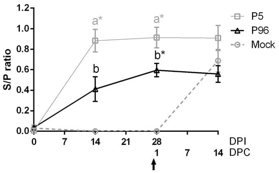 Figure 4. Changes in PEDV-specific immunoglobulin G (IgG) levels in plasma after PEDV strain Pintung 52 (PEDVPT)-P5 or PEDVPT-P96 inoculation and after PEDVPT-P5 challenge in all pigs. Plasma samples from ethylenediaminetetraacetic acid (EDTA)-anticoagulated blood were collected biweekly and diluted 20-fold. The levels of PEDV-specific IgG were detected by ELISA with PEDV particles as coating antigen and expressed as sample-to-positive control ratios (S/P ratio). S/P ratios were defined as the difference between the optical density (OD) values of sample and negative control divided by the difference between OD values of positive and negative controls. PEDV-specific plasma IgG levels are represented as mean ± SEM. The arrow indicates the time point when pigs were challenged with the low passage PEDVPT-P5 (27 DPI or 0 DPC) strain. The black, gray, and dashed lines illustrate the results for the PEDVPT-P96-inoculated group, PEDVPT-P5-inoculated group, and mock-infected group, respectively. *: significant difference with the mock group (p < 0.05); a, b: significant difference between groups labeled with different alphabets (p < 0.05).