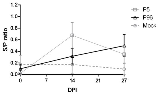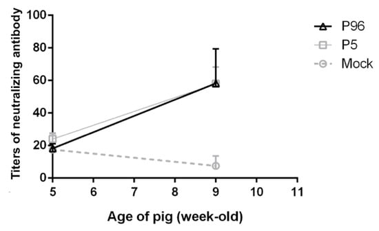Figure 6. Changes in plasma PEDV neutralizing antibody levels after inoculation with PEDV strain Pintung 52 (PEDVPT)-P5 or PEDVPT-P96. The plasma samples were collected from 5- and 9-week-old (0 and 27 DPI) pigs, and neutralizing antibody assay was performed. Values are represented as mean ± SEM. The black, gray, and dashed lines illustrate the results of the PEDVPT-P96-inoculated group, PEDVPT-P5-inoculated group, and mock-infected group, respectively.