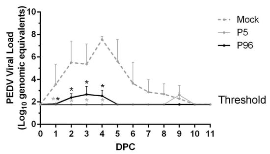 Figure 7. Fecal shedding of porcine epidemic diarrhea virus (PEDV) in PEDV strain Pintung 52 (PEDVPT)-P5- or PEDVPT-P96-inoculated pigs following PEDVPT-P5 challenge. Changes in the mean values GE/mL are shown as log10 values ± SEM. The threshold indicates the limitation of detection by the SYBR Green-based RT-PCR. The black, gray, and dashed lines illustrate the results for the PEDVPT-P96-inoculated group, PEDVPT-P5-inoculated group, and mock-infected group, respectively. *: significant difference in the mock group (p < 0.05).