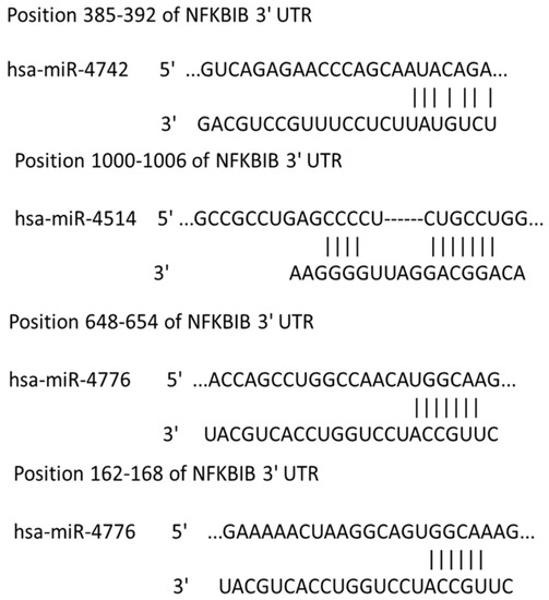 Target scan analysis of nuclear factor Kappa B inhibitor beta (NFKBIB) three prime untranslated region (3’ UTR). A search of the sequences for miRNAs miR-4514, 4742, and 4776 showed putative target binding sites in NFKBIB messenger RNA (mRNA).