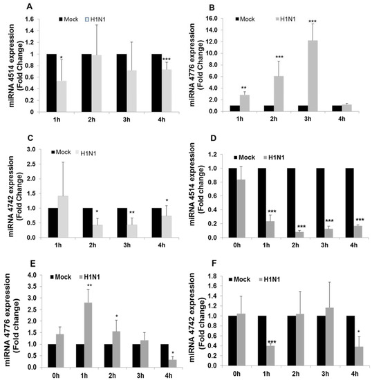 miRNA expression profile on exposure to IAV compared with mock and infected cells. (A) expression pattern of miR-4514. A549 cells were infected with IAV at multiplicity of infection (MOI) of 1 for 4 h and samples were taken every hour, miRNAs extracted and analyzed by reverse transcription-polymerase chain reaction (RT-PCR). *** p < 0.001; (B) expression pattern of miR-4776. A549 cells were infected with IAV at MOI of 1 for 4 h and samples were taken every hour, miRNAs extracted and analyzed by RT-PCR. ** p < 0.01, *** p < 0.001; (C) expression pattern of miR-4742. A549 cells were infected with IAV at MOI of 1 for 4 h and samples were taken every hour, miRNAs extracted and analyzed by RT-PCR. Data is from three independent experiments. * p < 0.05, ** p < 0.01; (D) expression pattern of miR-4514. Human bronchial epithelial cells (HBEpCs) infected with IAV at MOI 1 for 4 h and samples were taken every hour, miRNAs extracted and analyzed by RT-PCR. Data is from three independent experiments. *** p < 0.001; (E) expression pattern of miR-4776. HBEpCs were infected with IAV at MOI of 1 for 4 h and samples were taken every hour, miRNAs extracted and analyzed by RT-PCR. Data is from three independent experiments. * p < 0.05, ** p < 0.01; and (F) expression pattern of miR-4742. HBEpCs were infected with IAV at MOI of 1 for 4 h and samples were taken every hour, miRNAs extracted and analyzed by RT-PCR. Data is from three independent experiments. * p < 0.05, *** p < 0.001. Expression of each miRNA was normalized to expression of U6 miRNA.